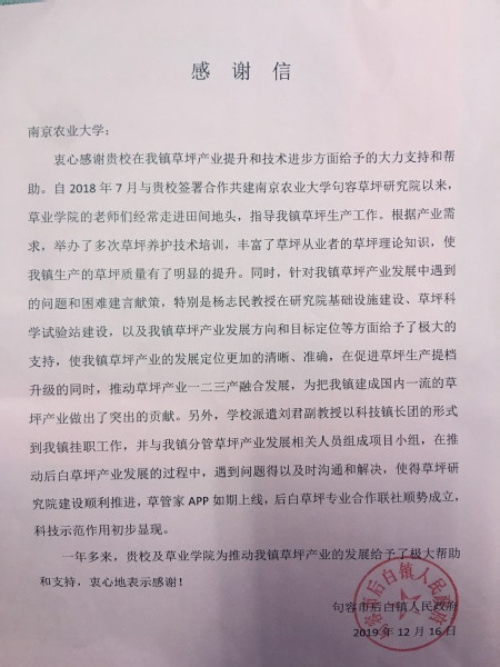 句容市后白镇人民政府发来感谢信,感谢我校为该镇草坪产业的发展做出了突出贡献,有效推动了草坪产业的提档升级和一二三产业融合发展。同时,对我校句容草坪研究院院长杨志民教授、句容科技镇长团成员刘君副教授为后白镇的草坪产业发展的辛勤付出表示感谢。