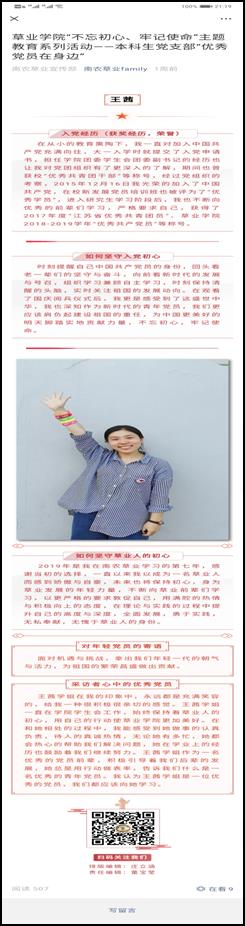201910月,本科生党支部2人一组,精心选取5名本科生党支部的优秀校友进行访谈,讲述他们的入党经历、优秀事迹,生动展现初心故事,通过阐述对草业人初心的认识,寄语年轻党员实现使命担当。1017日至1025日期间,优秀事迹一经推送,总阅读量为1145人次,单篇阅读量为507人次,超过学院本科生总人数,激励草业学子为我国草业学科蓬勃发展贡献力量。
