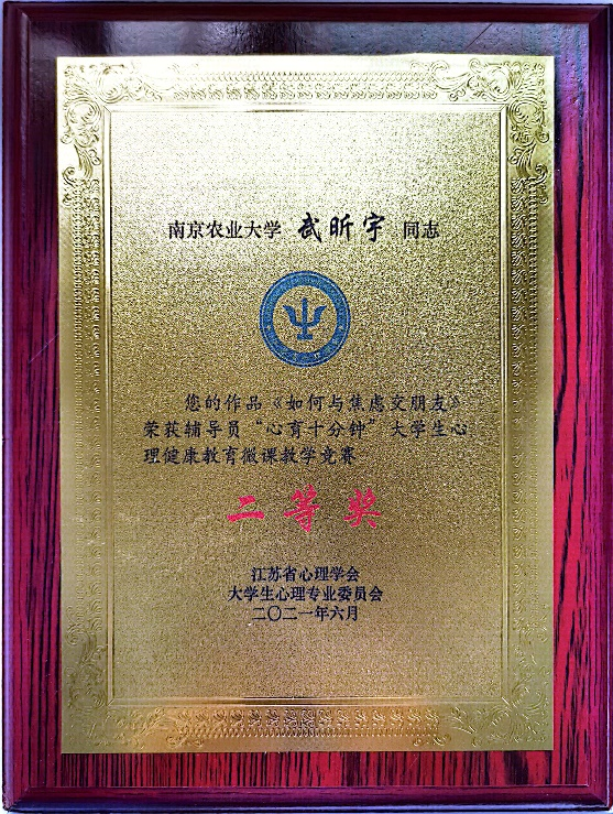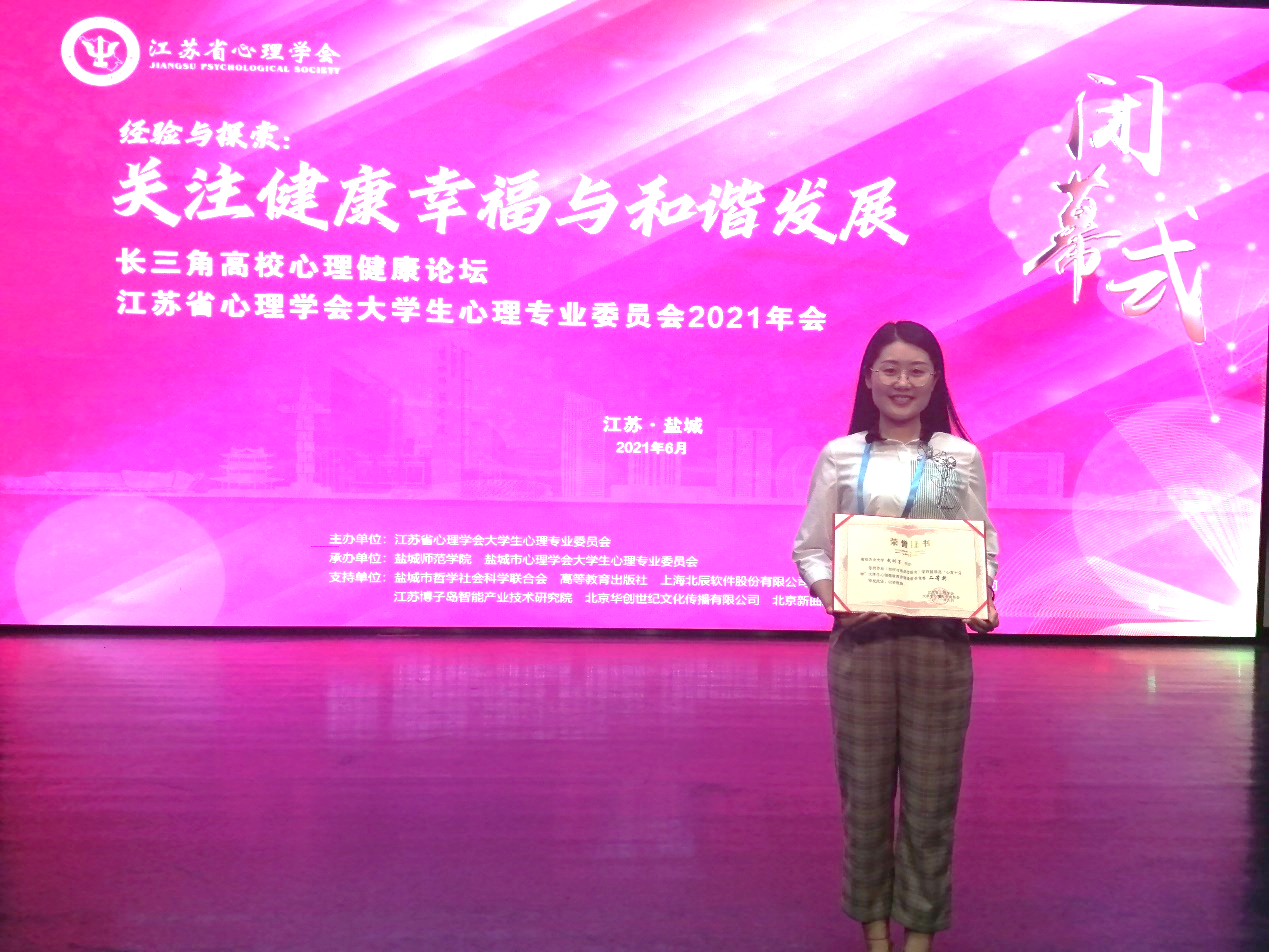 6月9日至11日,长三角高校心理健康论坛暨江苏省心理学会大学生心理专业委员会2021年会在盐城师范学院顺利举行。av在线 辅导员武昕宇代表av在线 ,参加了江苏省辅导员“心育十分钟”大学生心理健康教育微课教学竞赛,荣获二等奖。