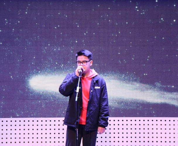 黄孜同学的独唱《想念》,声音嘹亮极具热情,那种自信提醒着所有听众:你一定要走,直至灯火通明。随着他的演唱,背景屏幕上轮番播放着学院同学的照片,有合影,有独照,同学们看着照片,不时发出惊喜兴奋的掌声。一曲唱罢,黄孜同学又继续唱了《我不知道》,似一位少年在迷茫慢慢倾诉,却不放弃努力与希望。