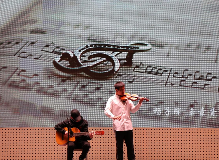 杨子琛和玉素甫同学合奏了一曲《卡农》;这是一种发端于13世纪 ,成熟于15世纪的复调音乐曲式。两种乐器用不同的调式与音色,两个声部,由简至繁,由单化复,在反复平常的进行中,演绎出交相共鸣出丰富效果,平凡的韵律脉动着瞬息万变的生命力,如同天使一般让人迷醉和沉静。