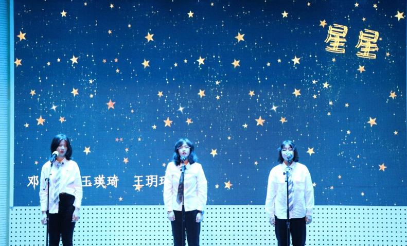 邓昕蔚、王英琦、王玥瑶三位同学给我们带来合唱《星星》,优美的歌声回荡在大活中心,将一切平凡的画面赋予深厚的意义。