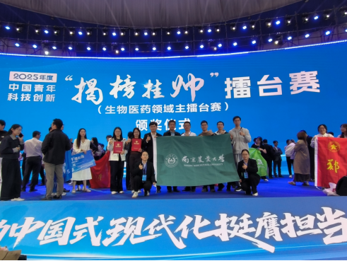 郭振飞两位教师的精心指导下,进行了紧张的备赛,顺利通过初审进入终审擂台赛。经过终审擂台赛紧张而激烈的比赛,杨波团队的“揭榜挂帅”项目荣获2025年度中国青年科技创新“揭榜挂帅”擂台赛(生物医药领域主擂台赛)特等奖。