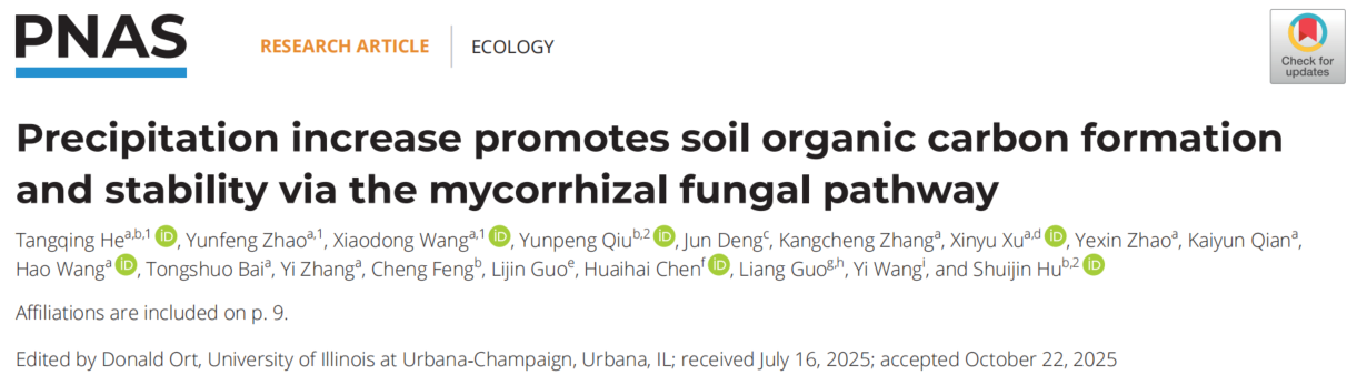 胡水金教授团队在《美国科学院院刊》(PNAS)上发表了题为“Precipitation increase promotes soil organic carbon formation and stability via the mycorrhizal fungal pathway”的研究论文。该研究依托黄土高原半干旱草地长期全球变化定位试验站,系统揭示了未来降雨增加情景下土壤有机碳形成与稳定的关键微生物驱动机制,取得重要进展。
