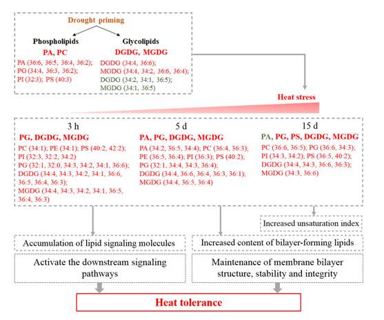 研究人员通过进一步的分析发现,干旱锻炼一方面诱导了信号脂类磷脂酸(PA)及其合成前体磷脂酰胆碱(PC)等的积累,从而激活下游胁迫信号通路,帮助植物应对高温逆境;另一方面通过调节各脂质组分含量,提高了易于维持双分子层稳定性的脂质含量,增加了膜脂不饱和度,维持了高温下膜双分子层的结构稳定性及完整性,进而提高高羊茅植株高温胁迫耐性。该研究结果以“Lipi-domic reprogramming associated with drought stress priming-enhanced heat tolerance in tall fescue (Festuca arundinacea)为题近日在国际知名学术期刊《Plant, Cell & Environment》(5年影响因子6.151)发表。