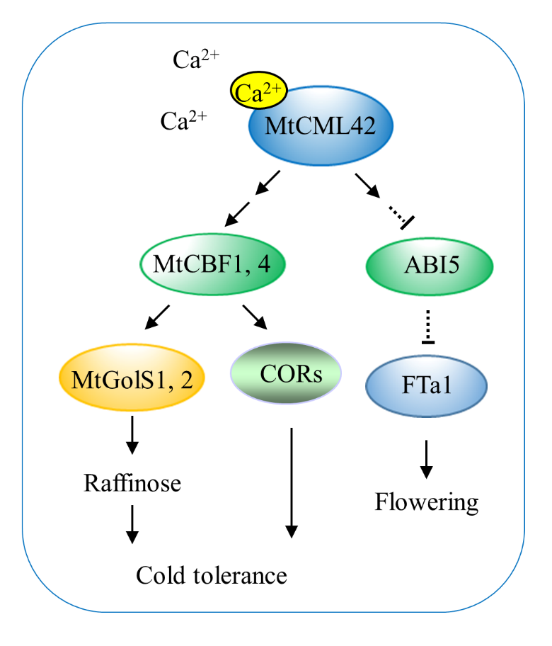 发现MtCML42 正调控 MtCBF1 和 MtCBF4 的表达,进而上调一些 COR 基因,MtGolS1和MtGolS2 的表达,导致棉子糖积累和耐寒性增加。MtCML42 通过依次下调 MtABI5和上调MtFTa1的表达来调节开花时间。