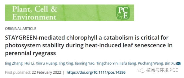 徐彬研究组在Plant, Cell & Environment 上发表了题为“STAYGREEN-mediated chlorophyll a catabolism is critical for photosystem stability during heat-induced leaf senescence in perennial ryegrass”的研究论文,详细阐述了STAYGREEN基因(SGR或NYE1)介导的Chla分解代谢调控多年生黑麦草叶绿体发育、活性氧(ROS)代谢、光系统稳定性及耐热性的机理。