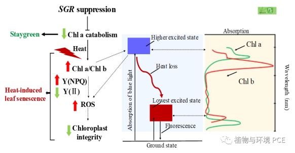 SGR编码脱镁甲基化酶,催化Chla的降解。敲除或抑制SGR表达延缓Chla降解,植物在自然发育或黑暗诱导衰老过程中呈现滞绿表型。高温胁迫条件下,持续抑制黑麦草SGR的表达水平呈现迟绿表型,生长力变弱。进一步分析发现,高温条件下,抑制SGR表达导致叶片内的O2-和H2O2含量显著上升、细胞膜和叶绿体完整性破坏、光系统蛋白含量及电子传递效率等显著下降。该结果表明,由于Chla吸收短波长光效率高于Chlb,高温下抑制SGR表达导致Chla降解受阻,加剧了光电子传递链中ROS的产生。转录组分析还发现,抑制SGR表达促进ROS合成基因抑制降解基因的表达,进一步导致高温条件下ROS的积累。