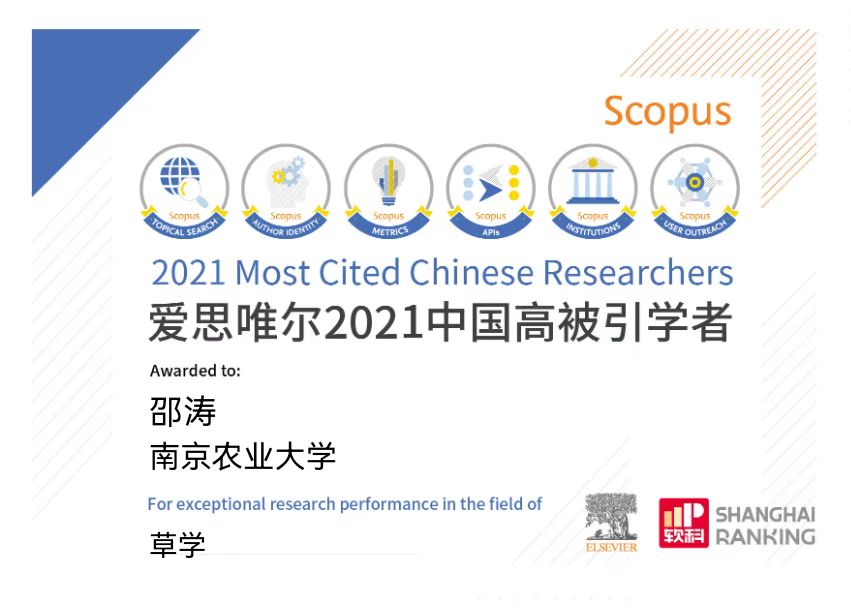 爱思唯尔(Elsevier)于2021年4月14日发布2021年“中国高被引学者”(Most Cited Chinese Researchers)榜单,草学学科共有5人入选,av在线 郭振飞教授和邵涛教授荣登榜单,入选人数占40%(2/5),居第一位。2021爱思唯尔“中国高被引学者”榜单以全球权威的引文与索引数据库——Scopus作为中国学者科研成果的统计来源,采用软科(上海软科教育信息咨询有限公司)设计的遴选方法,最终得到4701名各学科最具全球影响力的中国学者。