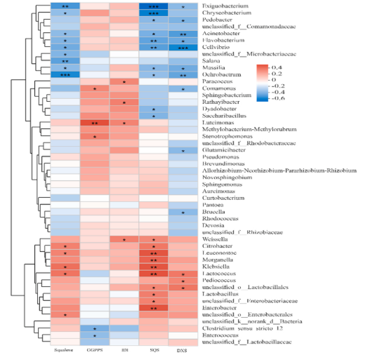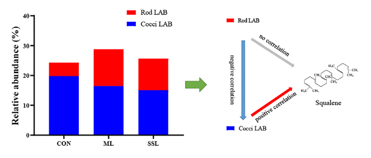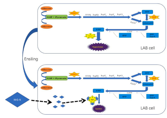 该团队发现新鲜的苜蓿中含有50.5 mg/kg FM 角鲨烯含量,而通过对7个不同农场的调研发现腐败的苜蓿青贮中含有60.3 ~ 73.9 mg/kg FM角鲨烯含量,但含有6种霉菌毒素(4.56 ~ 10,080 ug/kg FM)。因此,青贮过程中角鲨烯含量上升。为此利用不同温度和不同添加剂两种途径调控青贮发酵过程的微生物菌群,测定青贮过程中角鲨烯含量以及合成通路相关酶活,利用高通量测序技术测定微生物动态变化。最终追溯到球型乳酸菌在角鲨烯的合成中发挥了重要作用,但发酵产物氨态氮等对角鲨烯的合成具有负调节作用。