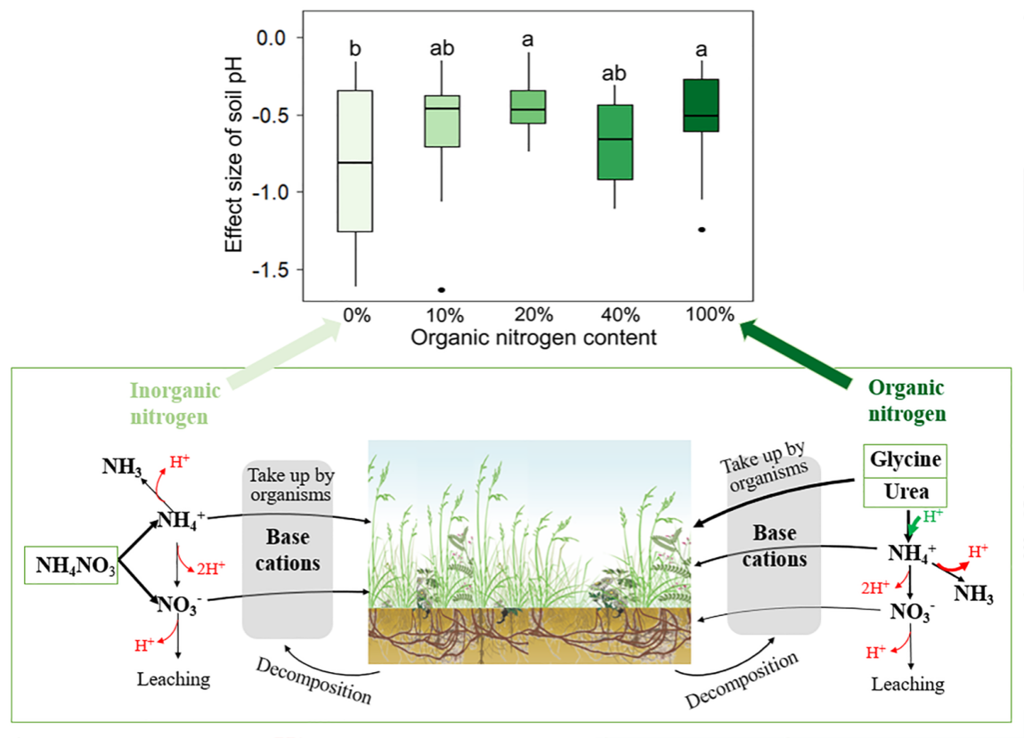 Meta分析发现,与无机氮添加相比,有机氮添加能够有效地降低土壤酸化速率(尤其是在高氮添加速率下)。五年的野外实验Meta分析的结果相一致,并进一步明确氮添加中有机氮能有效缓解土壤酸化,且在有机氮含量20%的有机无机氮组合添加下土壤酸化速率最低(图2)。酸化速率降低的内在机制是由于有机氮产生H+的速率相对较低,因为 NH3的挥发以及内蒙古草地的优势物种羊草(Leymus chinensis)可以利用有机氮和 NH4+(该过程H+产生的净贡献率均较低),最后导致硝化反应(对H+产生的净贡献率较高)所需的NH4+较少(图2)。此外,该研究组还发现氮添加中有机氮也能有效降低温室气体 CO2 N2O的排放,该项研究于2021年发表在Environmental Pollution