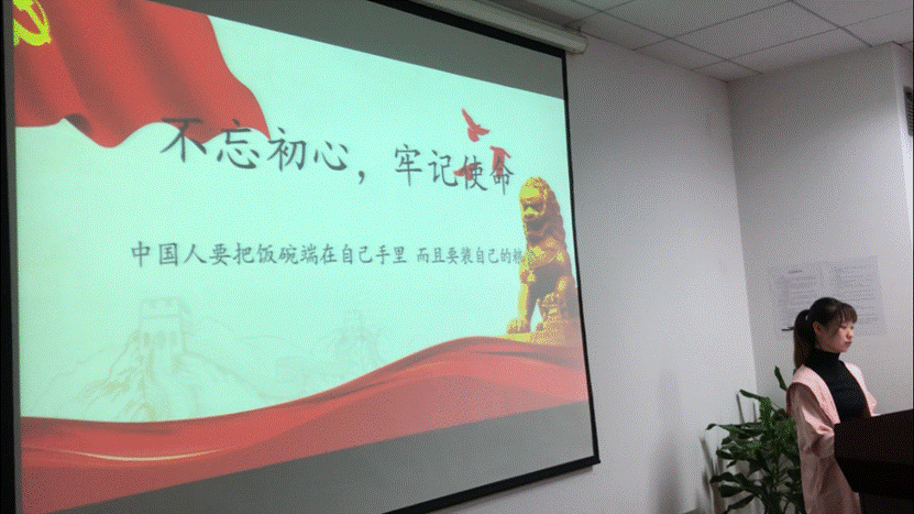 紧接着,陆佳馨同志结合微党课,讲到了“世界杂交水稻之父”袁隆平的光辉事迹。杂交水稻的出现,让中国水稻的产量实现了12吨/公顷的高产量。但是杂交水稻的培育过程并不是一帆风顺的,正是因为袁隆平不忘初心,牢记使命,坚定心中理想信念,才使杂交水稻在艰难岁月逐步攻克难关,最终实现大面积推广种植。另外国家坚持推动农业科技创新,对农业科技投入逐年巨增。还强调了中国人要把饭碗端在自己手里,而且要装自己的粮食。