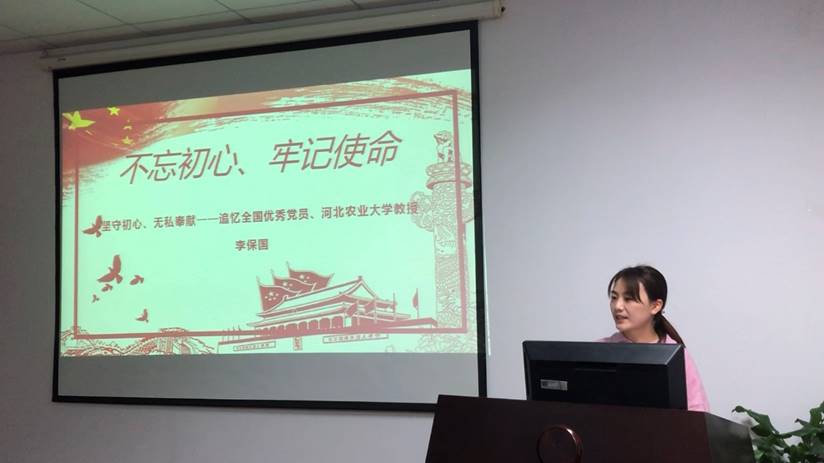 首先,由羿明璇同志结合微党课上了《时代楷模 太行山上的新愚公 李保国》的微党课,她结合自己在河北农大的见闻,给大家讲述了李保国同志的先进事迹:太行山区的农民亲切地称他为“太行财神”——在他精心培育、潜心研究和全力推广下,“绿岭”核桃、“富岗”苹果等脱颖而出,声名远扬,给太行山的农民带来滚滚财富。他先后取得研究成果28项,获得省部级以上奖励18项,培育了16个山区开发治理先进典型,带动10万山区农民增收58.5亿元;参与开发的聚集土壤、聚集径流“两聚”理论,使邢台前南峪森林覆盖率达到90.7%,植被覆盖率达到94.6%。李保国在教书育人的同时,把讲台和实验室搬到太行山,为林果富民呕心沥血。