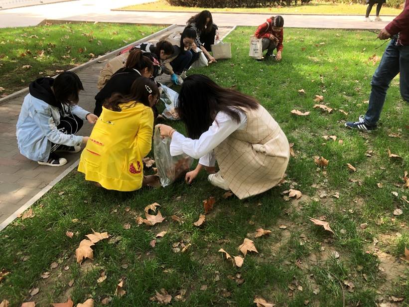 教学楼前进行拔除杂草志愿活动。