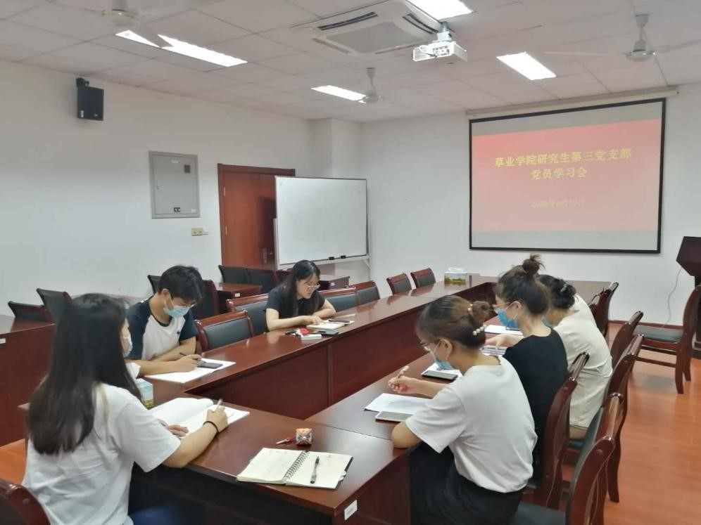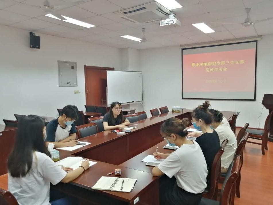 第十二次代表大会的精神,从学科发展,人才培养,科技创新、社会服务、国际合作、条件建设等六个方面介绍学校发展的成就,还结合1335发展战略的内涵解读,使支部成员对学校的发展现状与未来展望有更进一步的认识。另外,书记赵娜还从国家、学校和学院三个层面讲述草业发展新机遇,其中国家层面涉及生态建设的日益重视,农业产业结构调整,绿肥体系的再发展,学校和学院也有相应的措施响应国家的号召,这使得支部成员对自己所研究的课题更有动力和信心。