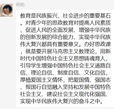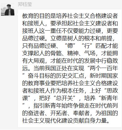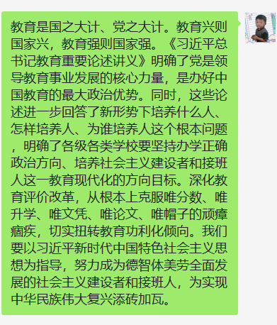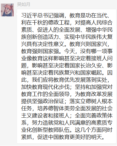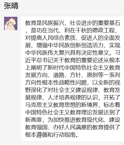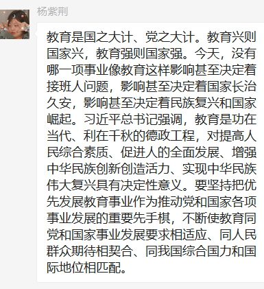 第三党支部党员群中积极发表学习心得。通过本次学习,我们认识到,习近平总书记关于教育的重要论述从根本上阐明了新时代中国特色社会主义教育发展方向、道路、方针、原则等一系列方向性根本性战略性问题,以全新的视野深化了对社会主义建设规律、教育发展规律、人才培养规律的认识,开拓了马克思主义教育思想的新境界,为加快推进教育现代化、建设教育强国、办好人民满意的教育提供了根本遵循和行动指南。
