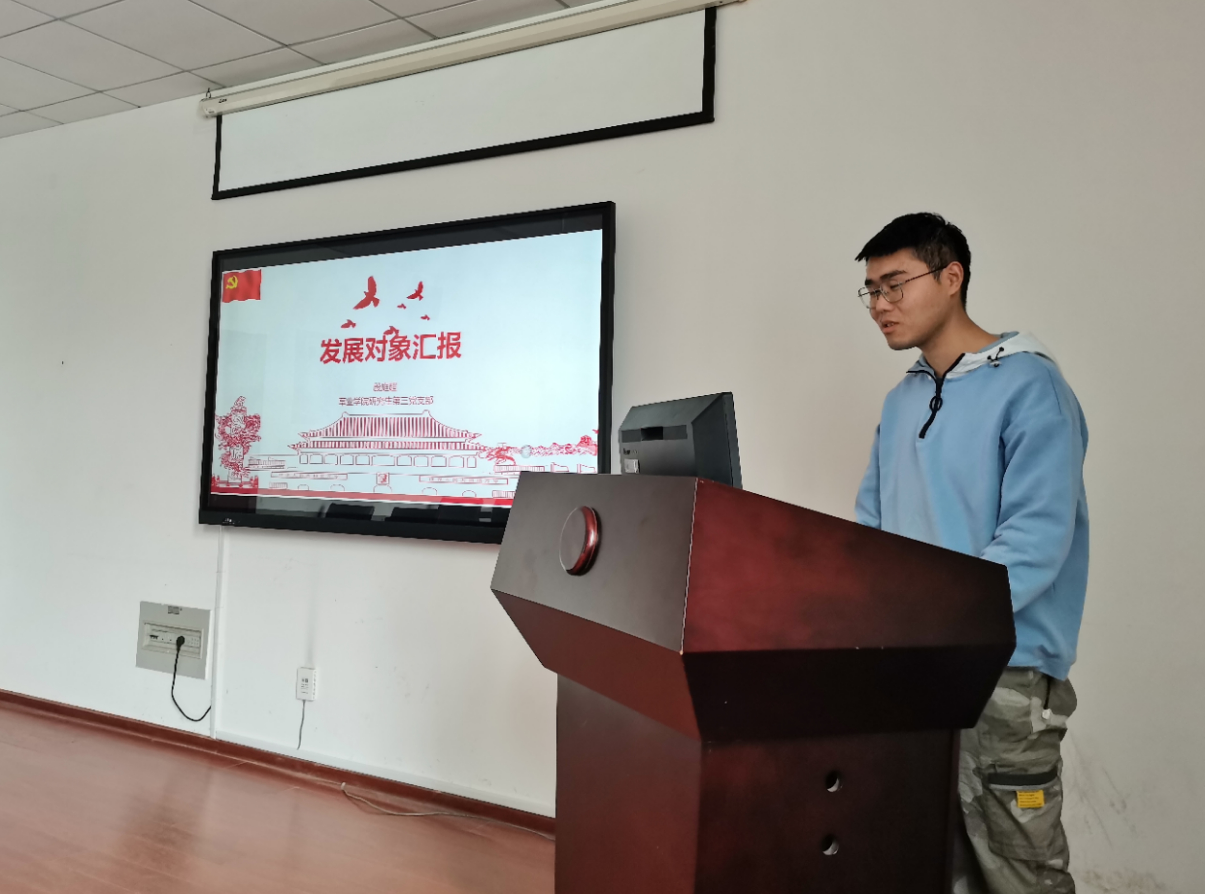 会议第一项,按照党组织接收预备党员的程序,两名发展对象罗思敏和殷庭超就他们自身情况、入党动机和对党的认识进行了简短汇报,支部副书记张晴和党员郑钰莹作为入党介绍人向支部全体党员同志简要介绍了入党发展对象的政治思想、学习、科研工作生活情况,随后由支部书记赵娜作政审情况说明,并对罗思敏和殷庭超两名发展对象是否符合党员条件发表了意见。