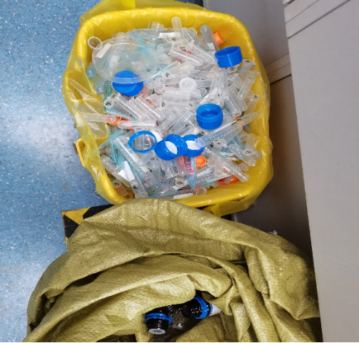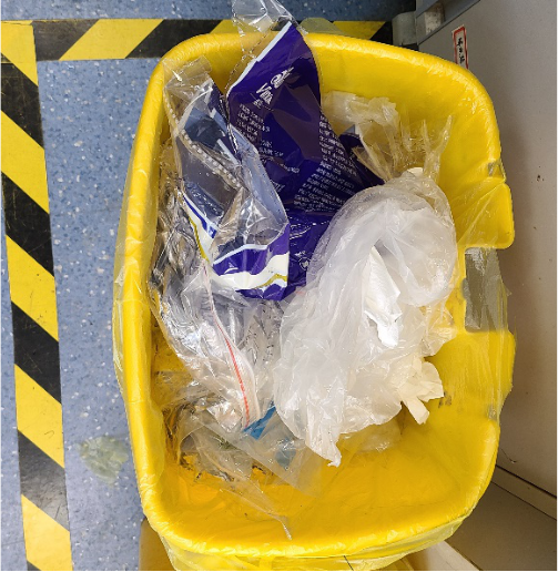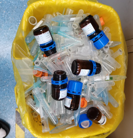 赵娜老师和郝田同志发现大家在扔实验室废弃物的时候没有做好软硬垃圾的分类,吴佳璇同志发现大家会将玻璃废弃物扔到专门盛放硬塑料的垃圾桶里。