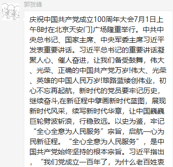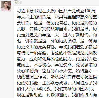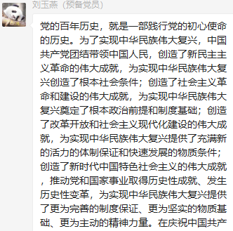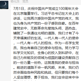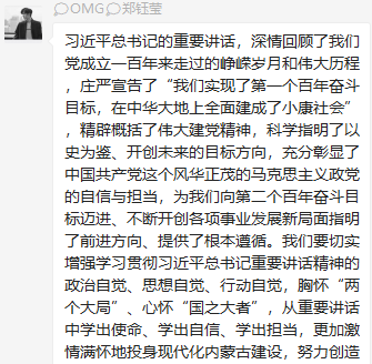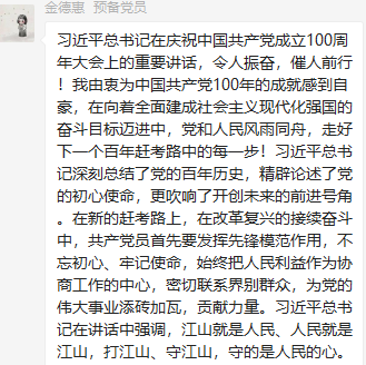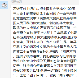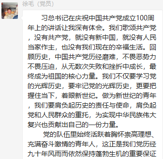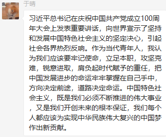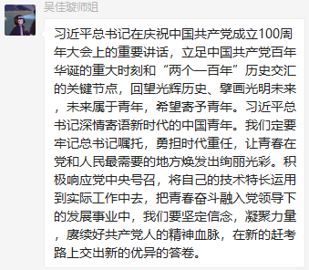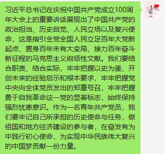 董瀛潞同志在av在线 研究生第三党支部党员群中分享了与习近平总书记在庆祝中国共产党成立100周年大会上的重要讲话相关的资料和视频,党支部各党员在群里积极发表学习心得。中国共产党的先驱们不怕牺牲、英勇斗争,开创了中国历史新纪元。我们要继续弘扬光荣传统、赓续红色血脉,永远把伟大建党精神继承下去并发扬光大。作为新时代的青年党员,我们要以实现中华民族伟大复兴为己任,牢记“请党放心、强国有我”的铮铮誓言,长志气、有骨气、添底气,成为堪当民族复兴重任的社会主义建设者和接班人。