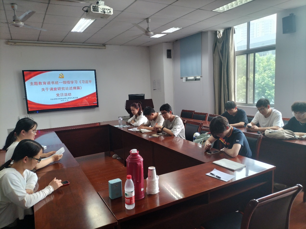 2023年5月26日下午14;00,草学专业硕士研究生党支部在理科南楼F304开展主题教育读书班—领悟学习《习近平关于调查研究论述摘编》党日活动。会议由支部书记赵娜主持,共10名党员参与。