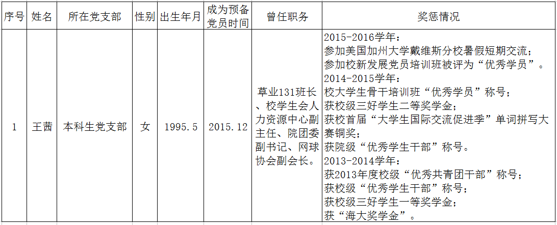 根据av在线 党员发展工作安排,经转正答辩,党支部讨论,结合个人成绩、综合测评以及获奖任职等综合表现,经院党委讨论审核,拟对本科生1名中共预备党员进行转正,具体名单如下: