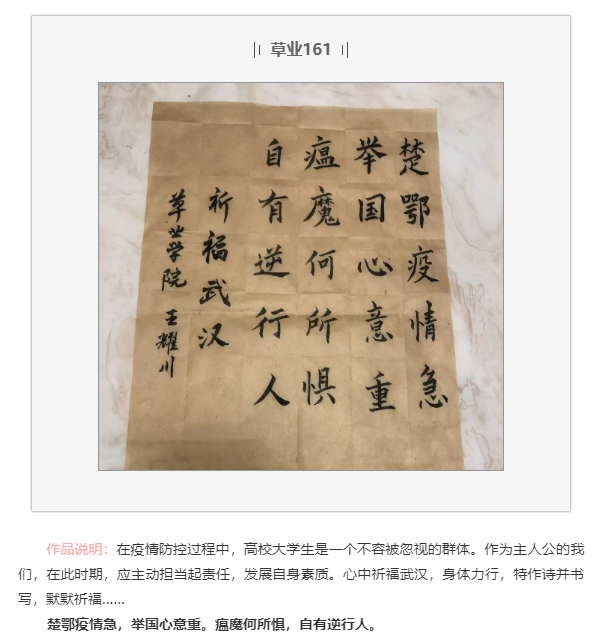 同学们积极响应学校的“声援武汉”活动号召,通过绘画、书法、制作视频等方式表达对武汉同胞的积极鼓励与真切祝福。