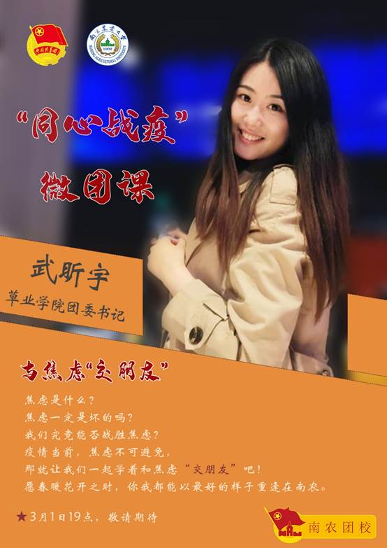 党旗所指,团旗所向。自疫情爆发以来,南农团委按照学校党委和上级团组织有关部署,引领广大青年积极落实各项疫情防控措施。为了帮助南农学子克服焦虑情绪,调节心态全身心投入新学期的学习生活,我们特别邀请到了草业院团委书记武昕宇老师,为南农师生精心打磨一堂线上战”疫“微团课,教大家在疫情面前,学会与情绪和解,与焦虑“交朋友”。