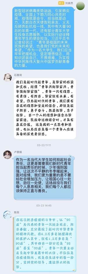 草业国际181团支部开展学习习近平总书记给北京大学援鄂医疗队全体‘90党员的回信线上学习,讨论青年大学生的使命与担当。