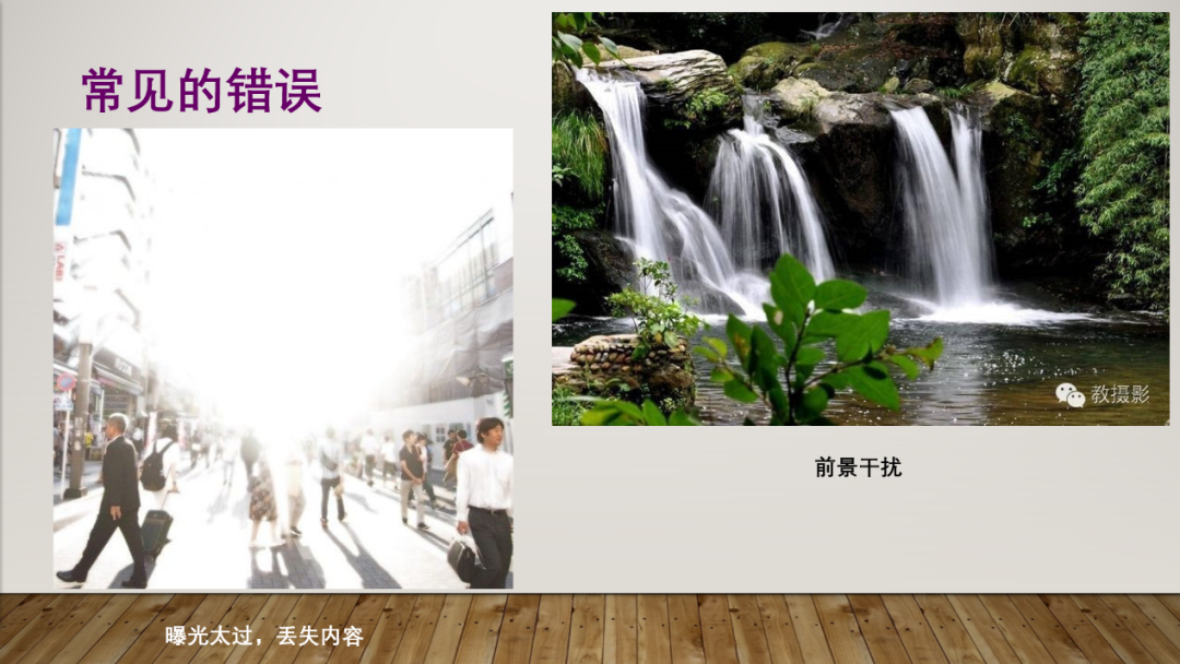 接下来学习了摄影中常见的错误,镜头运用不当,主体距离过近,比例失调,违背常识、背景混乱,无关物横生枝节,干扰主题、前景异物,遮挡主体、主体肢体不全、画面不正,水平歪斜,摇摇欲坠、局部曝光不足或过曝,细节丢失,信息不全、景深过小或过大,主题丢失或被淹没、聚焦不准,画面模糊,而这些错误都需要我们通过不断的练习去改正。
