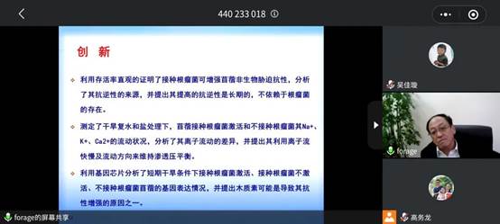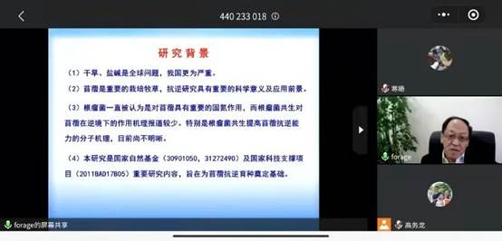 呼教授以《根瘤菌接种对苜蓿抗逆性的影响》为题展开报告。干旱和盐碱环境不利于苜蓿生长,而根瘤菌对苜蓿具有重要的固氮作用并能提高苜蓿的抗逆性,研究根瘤菌共生对苜蓿抗逆性的影响具有重要科学意义和应用前景。