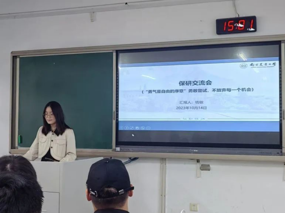 会议开始,学院团委组织部部长唐梦圆首先上台阐明了这次会议的主要目的——让学生们对今后的大学生活有大致的规划。随后,七位已经通过推免被录取为2024级研究生的大四学姐依次上台发言,分别从几个方面详细地介绍了保研的各个事项。