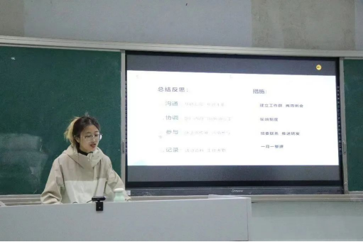 学生会执行主席龚蔬雨由先前团委学生会组织或参与过的院校办活动为引,通过展示针对先前工作中出现的问题所施行的措施,如建立专门的工作小组群、两周一例会,总结经验教训,以此来为以后同学之间相互合作,提高工作效率贡献解决方案。