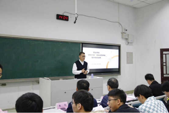 院长张炜教授讲话,张炜在讲话中指出,全体师生要着力推动本科生导师制落地生根,要充分发挥学院各项优势特色,帮助学生了解专业、明晰职业规划、培养科学研究能力、促进学生成长成才,全体教师要潜心教书育人、积极发掘学生潜力、落实四年一贯制本科生导师制工作要求,共同构建有特色、有成果的师生共同体。