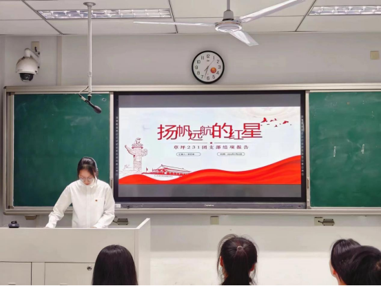 谢佳霖同学汇报的主题是”积跬步,至千里“,从以下四个方面介绍了草业231团支部年度工作:机制建设、学风建设、文化建设、特色活动建设。其中提到在支部每一位成员的共同努力下,草业231班在关注成员个人全面发展、丰富学习生活方面获得的成果尤为突出,共获大小奖项三十余项。