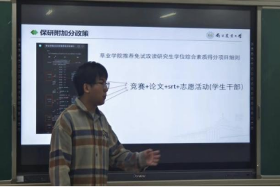 汪阳细致讲解了学院推荐免试攻读研究生学位综合素质得分的细则,并介绍相关保研条件,让同学们对保研有了更为全面的了解,帮助同学们明确今后努力的方向。