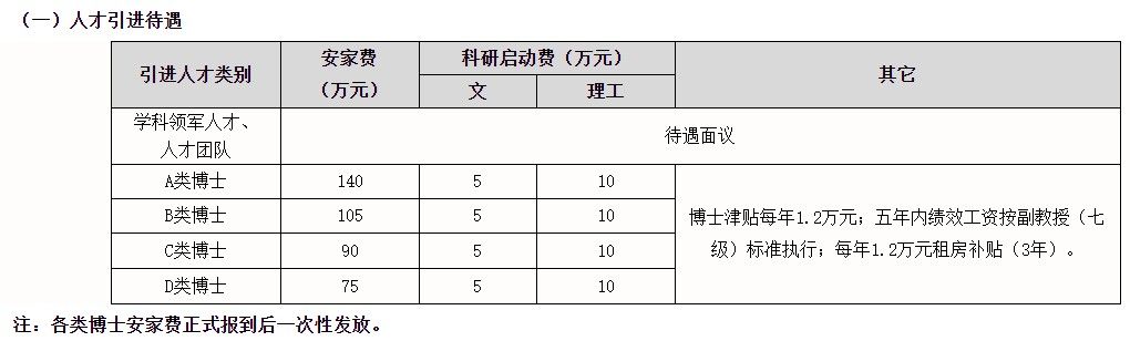 其中待遇最高的A类博士将获得安家费140万元,B类博士将获得安家费105万元,C类博士将获得安家费90万元,D类博士将获得安家费75万元。另外,上述几类博士在科研启动费方面文科为5万元,理工科为10万元。在津贴方面,皖西学院方面规定:博士津贴每年1.2万元;五年内绩效工资按副教授(七级)标准执行;每年1.2万元租房补贴(3)