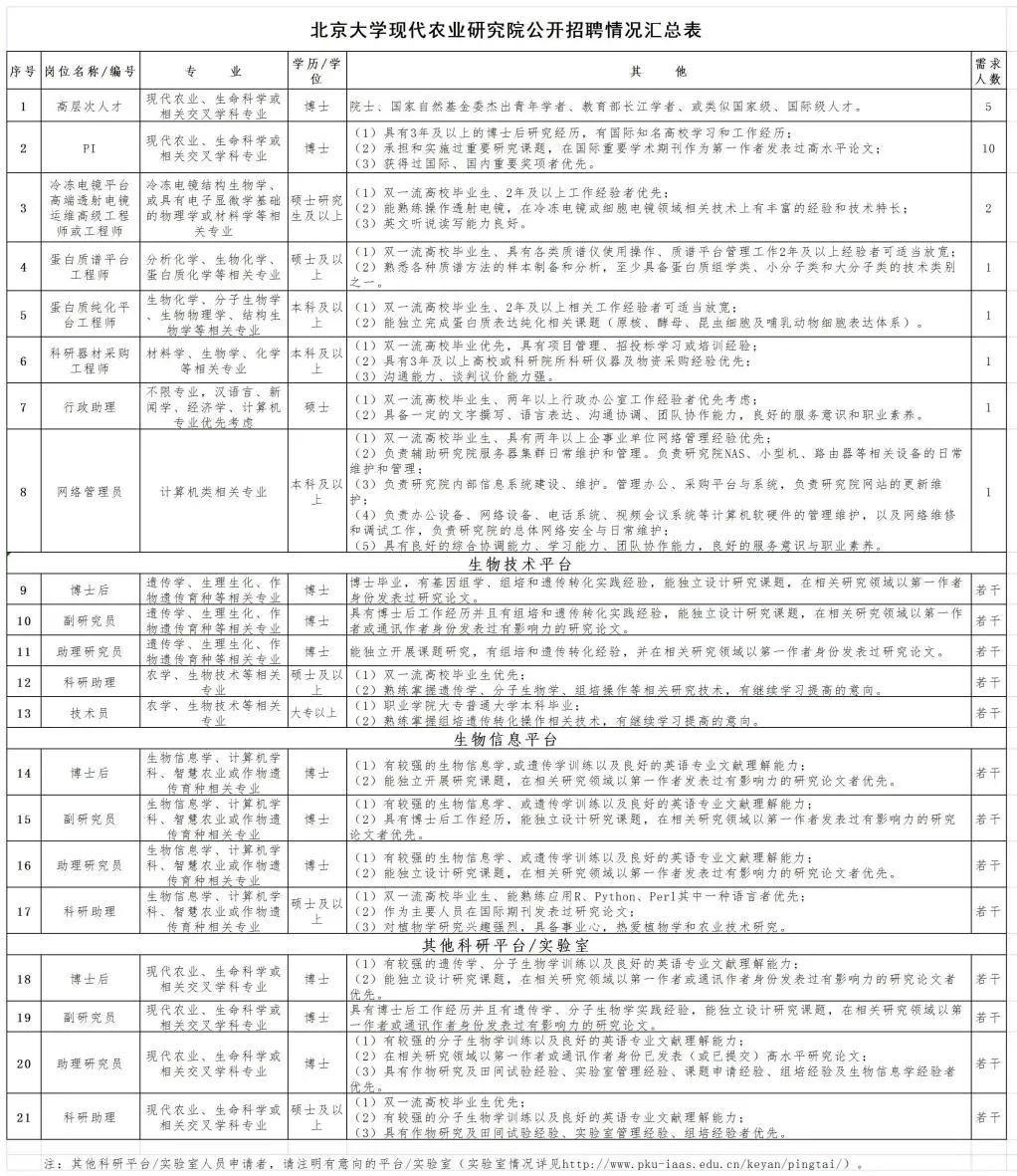 北京大学现代农业研究院是北京大学与山东省政府共建的,有180个固定事业编制的省属公益二类事业单位,坐落在素有“中国农业看山东、山东农业看潍坊”的山东省潍坊市。世界著名生物学家、美国科学院院士、北京大学教授邓兴旺任院长。未来,研究院拟建成一支拥有500名科研及管理人员的国际一流团队,致力于开展前沿农业研究,积极服务国家及地方重大战略。根据业务发展需要,现面向全社会公开招聘科研及管理人员。