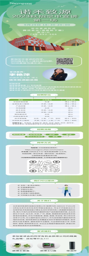 9月29日 18:30-20:00 诺禾致源2023秋招空中宣讲第一场,敬请期待!
