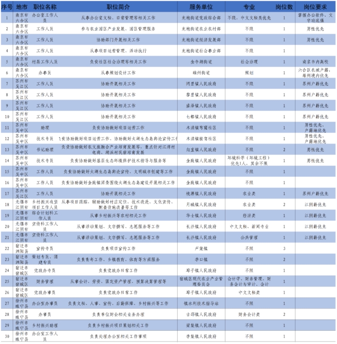 为拓宽我校毕业生在基层干事创业途径,服务乡村振兴战略,校团委与南京六合区、苏州吴江区、苏州吴中区、无锡江阴市、徐州睢宁县、宿迁宿城区、宿迁泗阳县等7地团委共同合作,定向招募36名志愿者,在各地街道、园区从事基础教育、农业科技、医疗卫生、青年工作、社会治理等方面的志愿服务。
