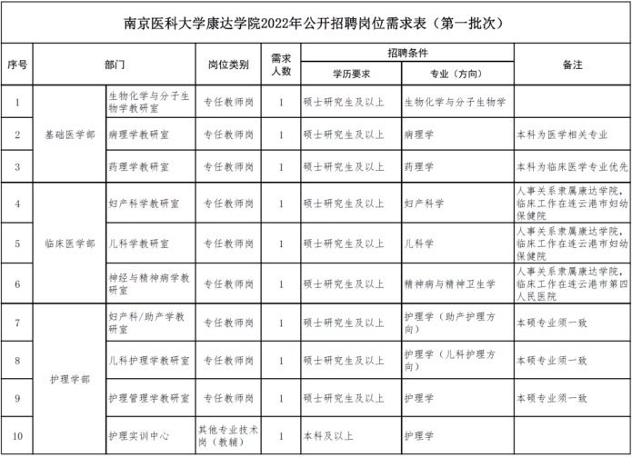 应聘人员应满足岗位所需的专业知识、能力或技能条件,符合招聘岗位的要求,具体岗位及要求详见《南京医科大学康达学院2022年公开招聘岗位需求表(第一批次)》(见附件)。