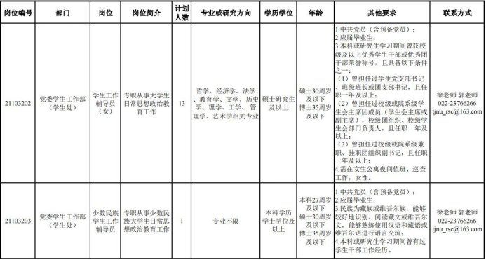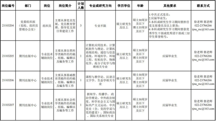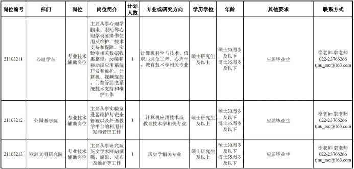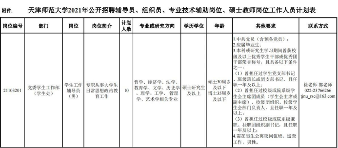 公开招聘方案于2021年4月8日在天津市教育委员会网站(//jy.tj.gov.cn)、天津师范大学门户网站(//www.tjnu.edu.cn)、天津师范大学人事处主页(//rsc.tjnu.edu.cn)公开招聘专栏发布。具体招聘岗位见《天津师范大学2021年公开招聘辅导员、组织员、专业技术辅助岗位、硕士教师岗位工作人员计划表》。(点击“阅读原文”下载)备注:官网已经找不到计划表