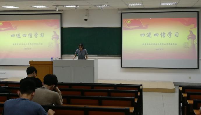 2018年5月18日晚8:30,av在线 全体本科生于教学楼C301进行了关于"四进四信"的集体学习。本次集体学习由av在线 团委副书记储晨主持,出席的老师有av在线 党委副书记高务龙。