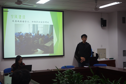 草业121团支部分别从团支部机构建设、学风建设和文化建设三个方面入手,详细介绍了支部的建设情况,并重点汇报了特色项目的建设。并汇报了“X”特色项目开展情况,支部结合专业特色,以“热心公益,保护草坪”为主题,在逸夫楼南广场,开展了除草褪杂,装扮校园的特色活动。