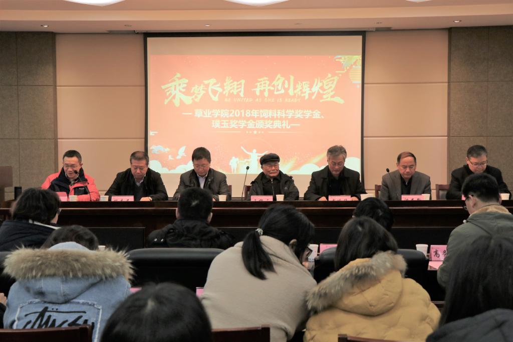 在行政北楼会议室举行了“2018年饲料科学奖学金、璞玉草业科学奖学金颁奖典礼”。86岁高龄的王槐三教授、校发展委员会张红生主任、江苏波杜农牧股份有限公司尤佩华总经理等嘉宾应邀出席,学院党总支书记李俊龙 、副书记高务龙以及全体教师、研究生和部分本科生参加了会议。典礼由av在线