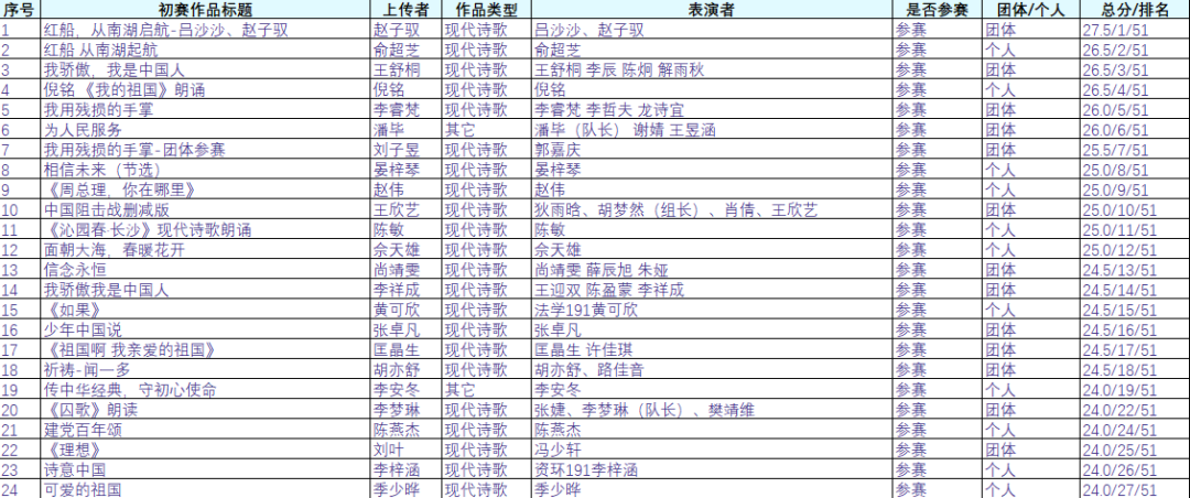 经过评委老师的打分,最终决出了24位参赛选手(团队)进入本次”声韵南农”朗读大赛的决赛。决赛名单如下: