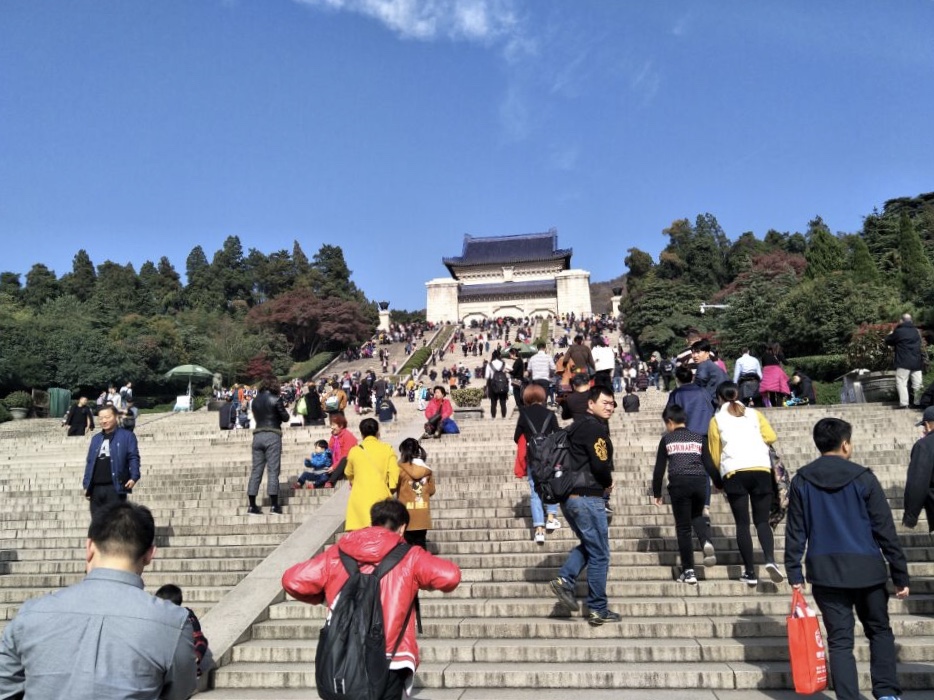 在学校集合完毕后,同学们到达紫金山下,一个个热情高涨,兴致勃勃,带着昂扬的斗志整装待发。从紫金山下到山上,整个爬山过程中充满了温馨、愉快,大家相互搀扶,相互帮助,相互鼓励,充分发扬了团结拼搏、不畏艰险的优良作风。踏过392级台阶后,同学们看到了陵门上镌刻着由孙中山手书天下为公四个字,在刘鹏同学的生动讲解下他们对一百多年前中山先生为中国所做的贡献更加了解。望着中山先生的雕像,仰视头顶的青天白日,同学们不禁肃然起敬。