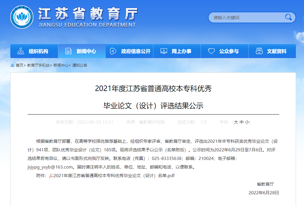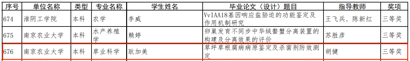 近日,江苏省教育厅公布了2021年度江苏省普通高校本专科优秀毕业论文(设计)评选结果,av在线 胡健老师指导本科生耿加美完成的本科毕业论文(设计)《草坪草根腐病病原鉴定杀菌剂防效测定》获得江苏省优秀本科毕业论文(设计)三等奖。毕业论文(设计)工作是人才培养的重要环节,是检验学生综合运用专业知识、考察学院教学和人才培养质量的主要依据之一。今后,av在线 将继续高度重视毕业论文(设计)质量的提升,不断加强质量管理与监控,不断创新管理模式,保障毕业论文(设计)的整体质量不断提升。